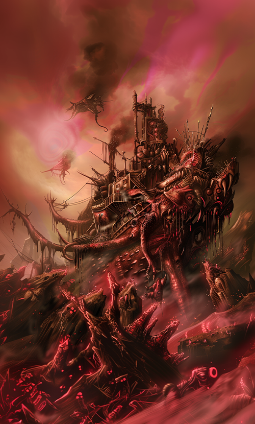 The hyve mind has powerful psychic abilities and mutations. The monstrous blightship is captained by High Blightspeaker La Almriante. The El Casco is propelled by a fleshy tail fin, rowing Kongregan, corrupted diesel engines, and skin sails.